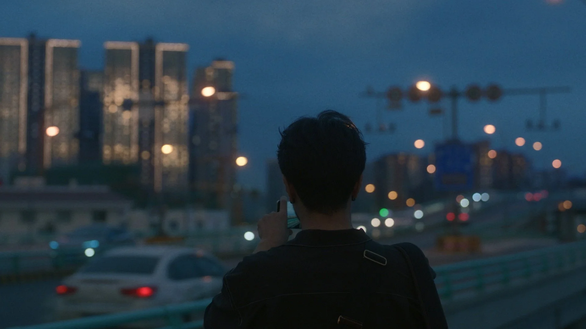 A person with short dark hair taking a photo of a cityscape at dusk, with blurred lights and construction cranes in the background.